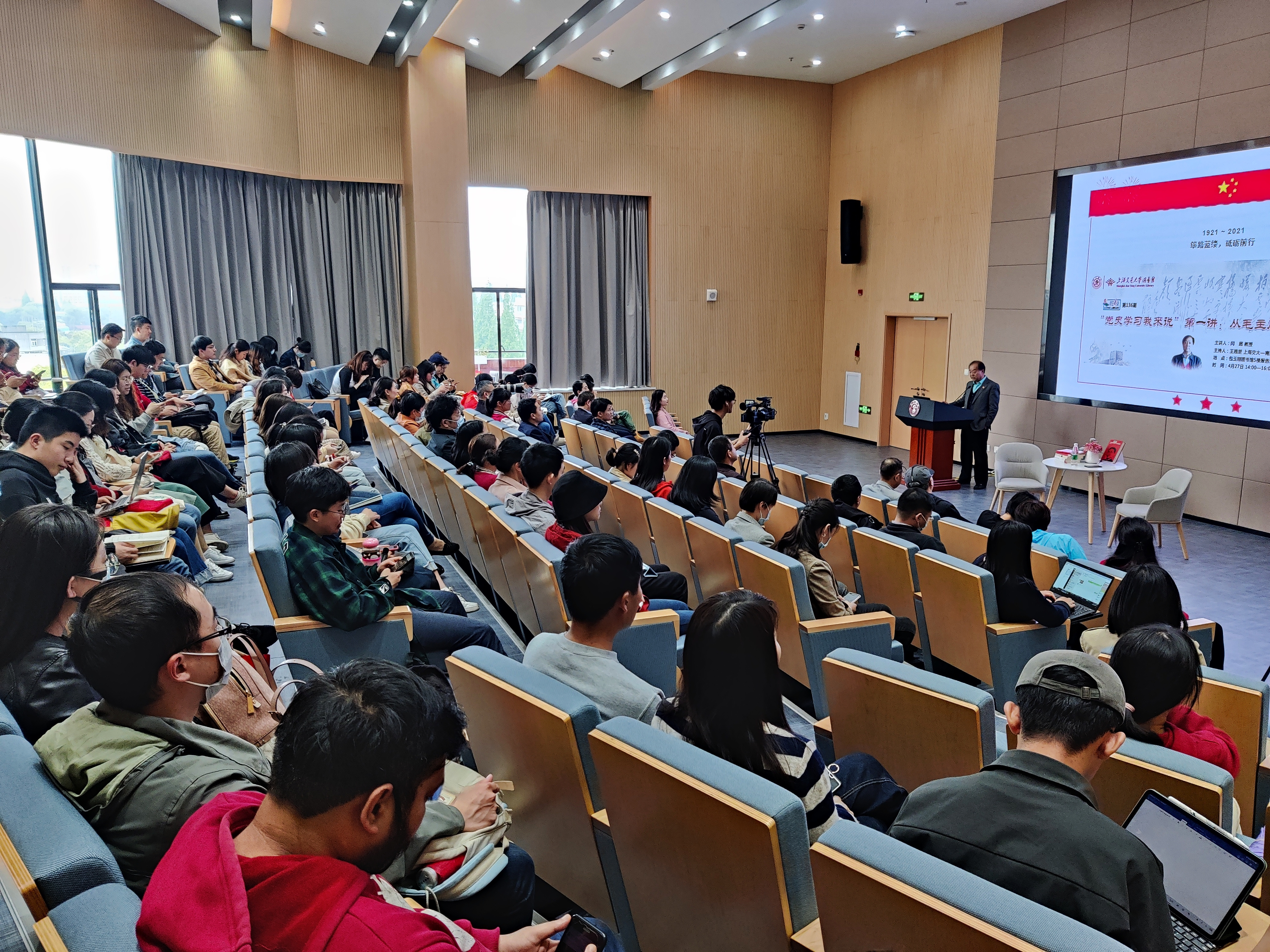 讲座在现场师生热烈的掌声中圆满结束。毛主席诗词诞生于充满艰辛的革命征途,诞生于血与火的战场,形象地再现了中国革命各个发展阶段的历史画面,对不少重大事件都留下了珍贵的艺术记录。在建党百年的重要历史时刻,重读毛主席诗词、重温我党初心具有重要意义,讲座现场的座无虚席,可见交大师生学习党史、感悟初心的高涨热情。