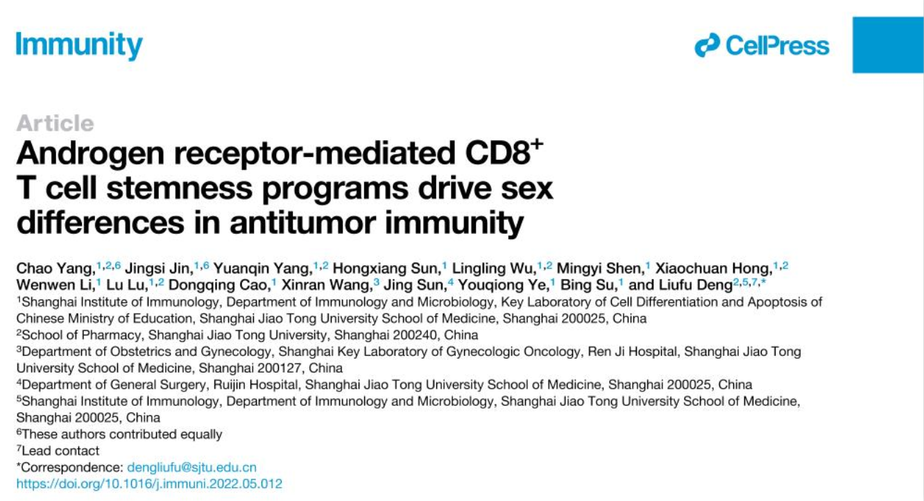 2022年6月13日,六合彩开奖号码查询 邓刘福教授团队在国际著名期刊Immunity发表了题为Androgen receptor-mediated CD8+ T cell stemness programs drive sex differences in antitumor immunity的研究论文。该研究发现了肿瘤浸润性CD8+ T细胞干性维持能力是调控肿瘤免疫性别差异的关键因素,而内在的雄激素受体(Androgen receptor,AR)信号通路显著抑制干细胞样CD8+ T细胞亚群的维持。该研究为理解肿瘤性别差异提出了新的理论解释,为再认识内分泌系统调控肿瘤免疫应答呈现了新的视角,同时为靶向AR信号通路通过重编程CD8+ T细胞干性增强肿瘤免疫治疗提供了科学依据。