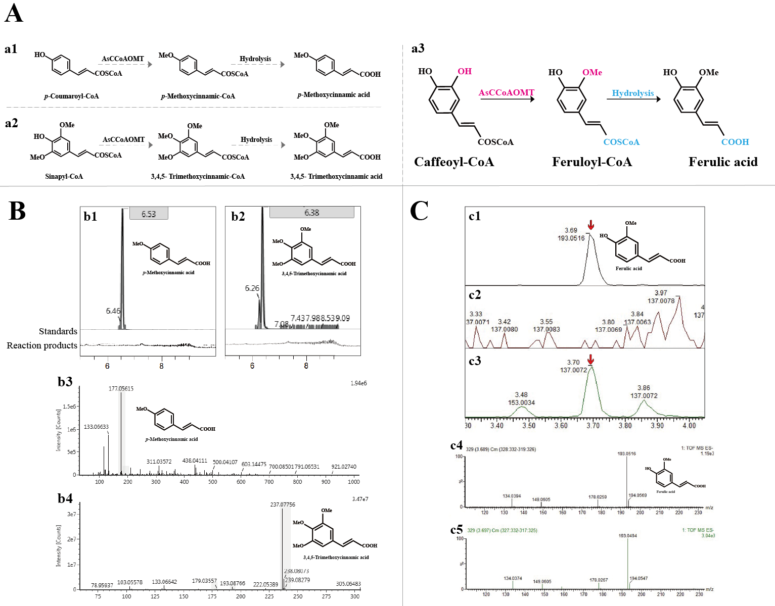 图1. AsCCoAOMT的体外酶活分析及底物特异性验证