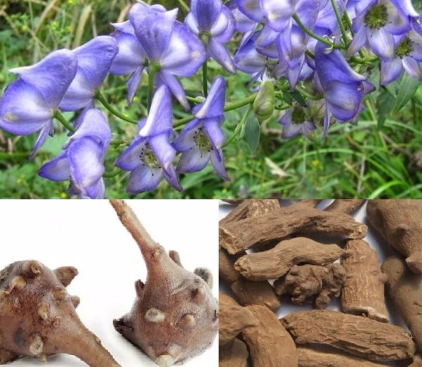 ▲乌头属植物,下左为中药附子,下右为中药雪上一枝蒿