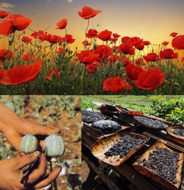 ▲罂粟花、生鸦片割取及熟鸦片