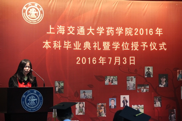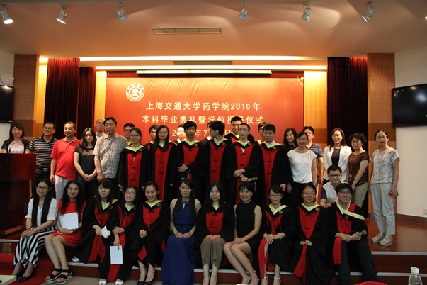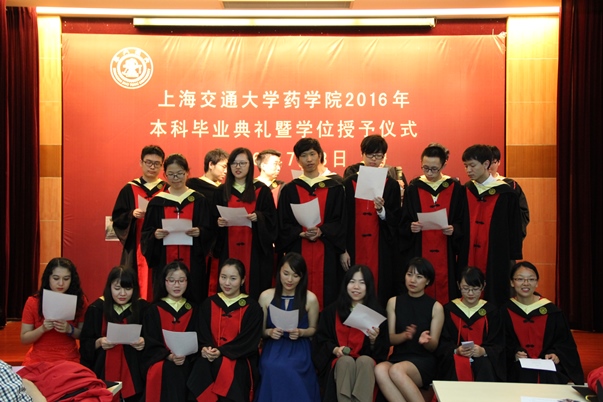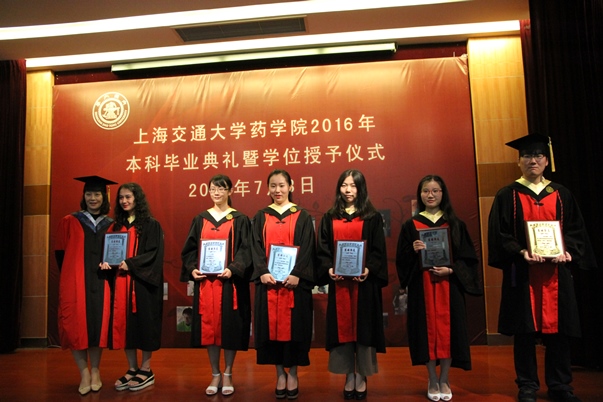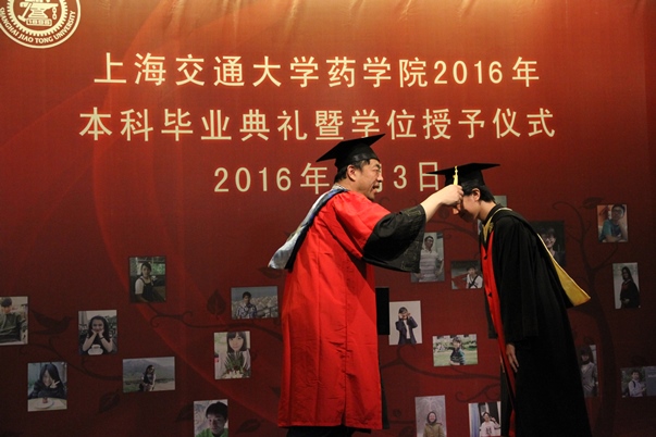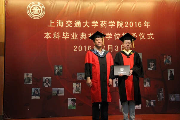 演讲完毕,刘明柱书记逐一为毕业生拨穗正冠、颁发毕业证书并合影。12级班主任徐宇虹教授为获得上海市优秀毕业生荣誉的沈凌杰、上海交通大学优秀毕业生荣誉的邢瞳、罗鹄乔、殷嘉菲、周冰洁、木亚斯尔同学颁发了相应证书。