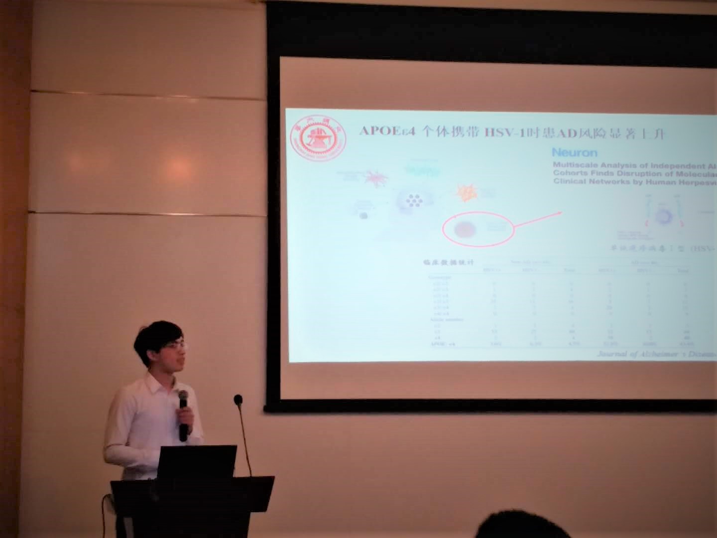 此次青年论文报告有来自六合彩开奖号码查询 、交大医学院、复旦六合彩开奖号码查询 、华东理工大学六合彩开奖号码查询 、同济大学医学院、海军军医大学六合彩开奖号码查询 等上海优秀高校和研究所的12位汇报人。经过4个多小时的学术报告,我院殷明老师课题组研究生高金超(导师:赵文娟)汇报的论文《载脂蛋白E4促进单纯疱疹病毒I型感染导致脑内Aβ沉积的神经免疫学机制》荣获优秀论文特等奖。阿尔茨海默病是高发于65 岁以上人群的神经退行性疾病,其病因和发病机制目前仍不清楚。APOE4是目前公认的散发性AD的高风险遗传因素。最近的研究发现,APOE4等位基因携带者是微生物感染导致AD发病的易感人群,包括HSV-1在内的微生物感染与APOE4等位基因两种因素的共同作用是散发性AD发病的主要原因。高金超等应用HSV-1分别经鼻感染不同基因型的APOE -TR小鼠,发现POE4促进HSV-1经鼻感染引起的脑组织内HSV-1扩增并导致脑内Aβ沉积,其机制与促进小胶质细胞分泌炎症因子及减弱CD1和NK T细胞参与的免疫应答异常有关,首次揭示载脂蛋白E4促进单纯疱疹病毒I型感染导致脑内Aβ沉积的神经免疫学机制。