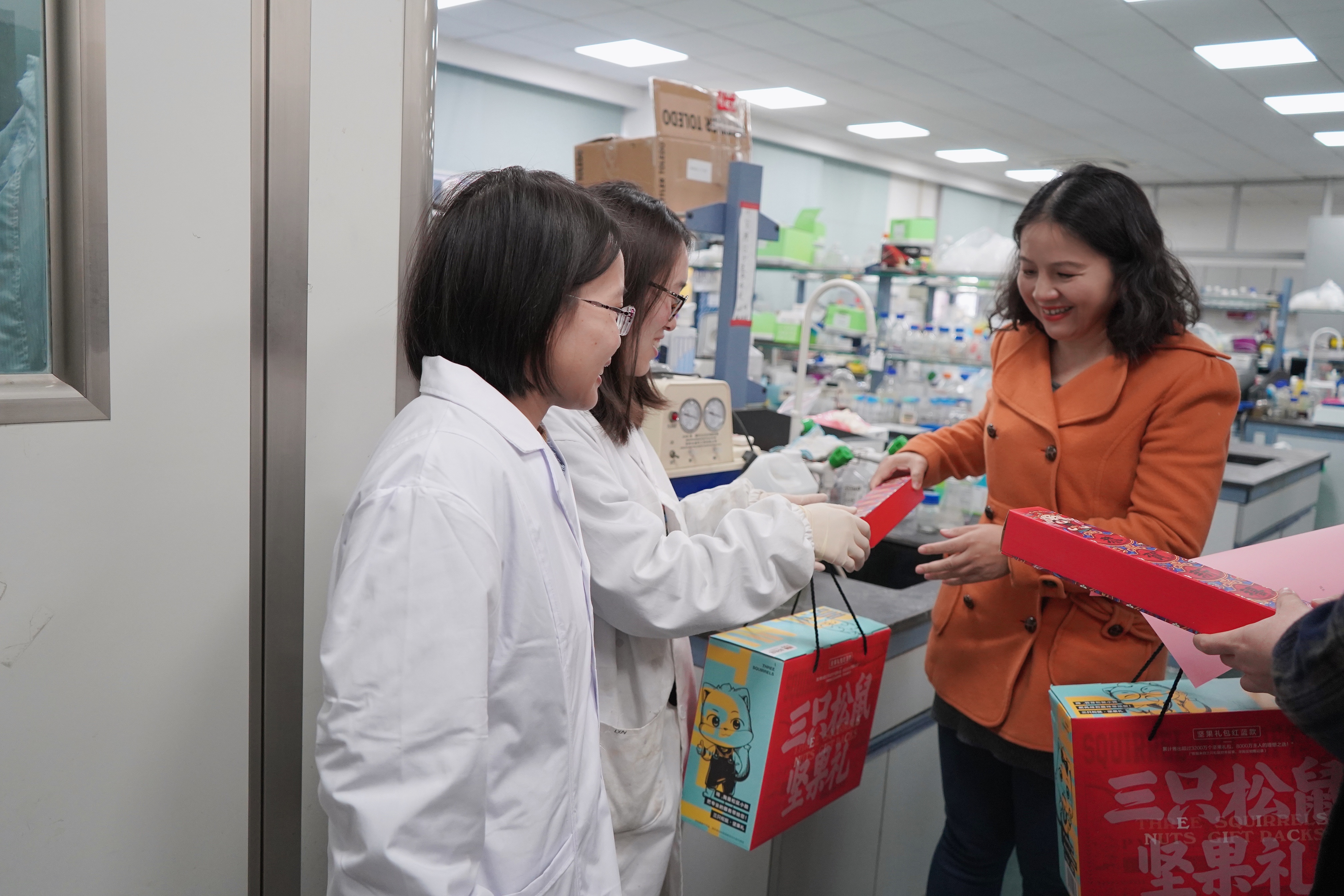 刘建新、张翱为参会同学发放了新春礼包并合影留念。
