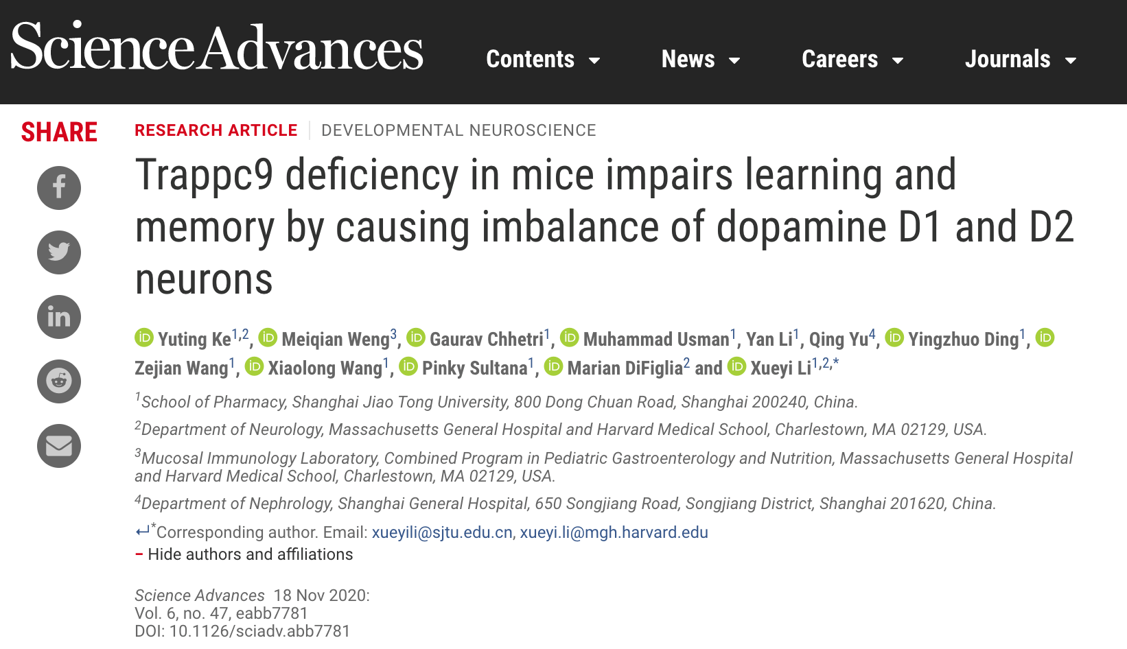 2020年11月18日,《Science Advances》在线发表六合彩开奖号码查询 李学义课题组最新研究成果”Trappc9 deficiency in mice impairs learning and memory by causing imbalance of dopamine D1 and D2 neurons” 。该研究揭示了TRAPPC9缺失引发疾病的分子机制,并为TRAPPC9关联性疾病的治疗提供了一个可行方法。六合彩开奖号码查询 博士生柯钰婷为论文的第一作者,李学义为该论文的通讯作者。该项研究受到了校基金会“包氏基金”的支持。