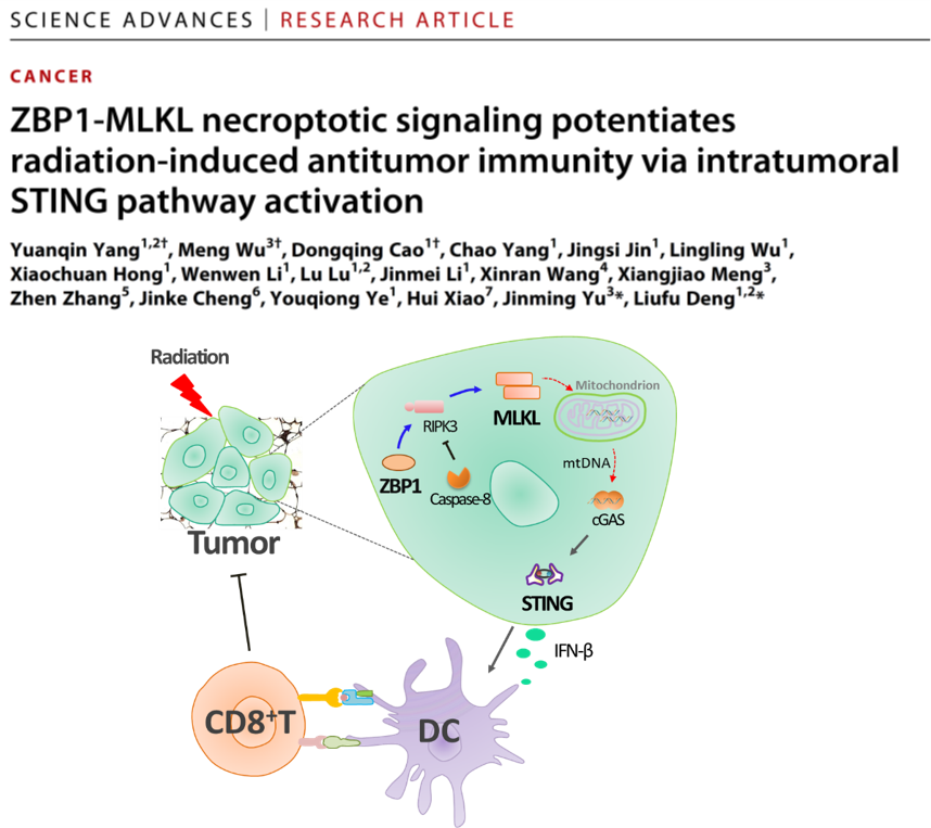 2021年10月6日,六合彩开奖号码查询 邓刘福教授团队和山东省肿瘤医院于金明院士团队合作在国际著名综合性学术期刊 Science Advances上发表题为“ZBP1-MLKL Necroptotic Signaling Potentiates Radiation-induced Antitumor Immunity via intratumoral STING pathway activation”的研究论文。