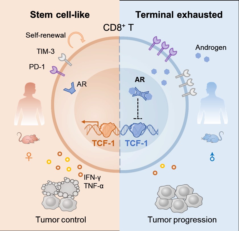 上海交通大学邓刘福教授课题组致力于CD8+ T细胞干性分化规律和逃逸特征的研究。课题组前期研究揭示了内源性cGAS(cyclic GMP-AMP synthase)-STING通路通过维持CD8+ T细胞干性以促进T细胞抗肿瘤免疫应答的作用机制,证明了STING通路的激活可以显著提高人源CAR-T细胞治疗的效果,为临床T细胞治疗的优化提供了新的策略和依据,相关研究成果已发表在转化医学国际著名期刊Science Translational Medicine(2020)。在此期间,课题组惊奇发现,男性的雄激素居然为干细胞样CD8+ T细胞精心编织了“囚笼”,限制了干细胞样的CD8+ T维持,“助纣为虐”促进肿瘤发生免疫逃逸,这为肿瘤发生发展的性别偏倚现象提供了新的理论解释,也对内分泌系统调控肿瘤免疫应答有了新的认识。