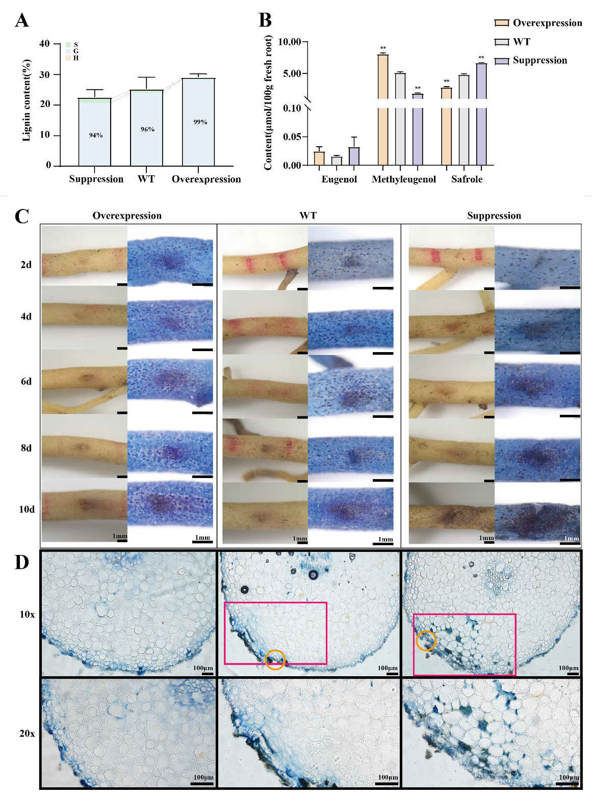 该研究通过克隆咖啡酰辅酶A-O-甲基转移酶(CCoAOMT)基因,分别进行了体外酶学分析,证明该酶高效催化咖啡酰辅酶A甲基化并具有高度的底物专一性;体内遗传转化,结果显示,RNAi诱导的CCoAOMT表达量下调显著降低木质素含量,而过表达则可将木质素含量提高近40%。同时,转基因华细辛植株在苯丙烯化合物甲基丁香酚和黄樟醚的含量比例上也表现出显著差异,AsCCoAOMT过表达系中甲基丁香酚/黄樟醚比率增加了168%,RNAi抑制系中降低了73%。这些结果表明,苯丙烯类化合物甲基丁香酚的生物合成优先于木质素。此外,该研究表明, AsCCoAOMT表达量下调导致华细辛根对病原真菌易感性显著提升,这意味着CCoAOMT在植物营养器官病害防御方面具有重要作用。此项研究对植物营养器官中木质素与苯丙烯类化合物生物合成之间的碳代谢分配机制提供了重要参考,也为中药成分合成生物学研究奠定基础。