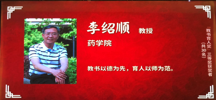 李绍顺教授从事高等教育工作30多年来,对教学工作兢兢业业、一丝不苟,从未因事、因病缺课或迟到。近年来,他承担研究生的《天然产物全合成》和本科生的《药物化学》及《新药设计与开发》等多门课程,在学院教学改革和学生培养中倾注大量精力。他承担学校的《课程建设组模式下的教学改革》研究项目并获得2010年上海交通大学教学成果二等奖。2017年承担学校《讨论式教学在药物化学理论和实验课程中的应用》教改课题。组织编写了国内药学专业首部《药物化学》双语教材,受到同行和学生好评,该教材被评为上海交通大学优秀教材一等奖,上海市教委优秀教材二等奖。《药物化学》课程曾被评为校级精品课程,上海市教委重点课程。此外,李绍顺教授还曾担任学院督导组组长,热心培养青年教师,受到青年教师由衷赞誉。