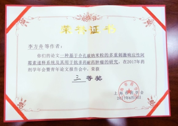 我院郭圣荣课题组硕士生俞燕娜、李方舟和朱浩的论文受到好评。俞燕娜所做的题为“一种NIR响应性吲哚菁绿和阿霉素共输送纳米粒的制备及其用于多药耐药肿瘤细胞化疗/光动力治疗/光热治疗的研究”的报告荣获一等奖,俞燕娜的硕士论文工作成果还被A档SCI学术期刊Acta Biomaterials接受发表。李方舟所做的题为“一种基于介孔纳米粒的多重刺激响应性阿霉素递释系统及其用于抗多药耐药肿瘤的研究”的报告荣获三等奖,李方舟硕士论文工作成果投稿A档SCI学术期刊CARBON, 受到评阅人好评,已俢回。朱浩的论文获鼓励奖,朱浩的硕士论文工作成果已在英国皇家化学会高水平期刊Journal of Materials Chemistry, B 发表。