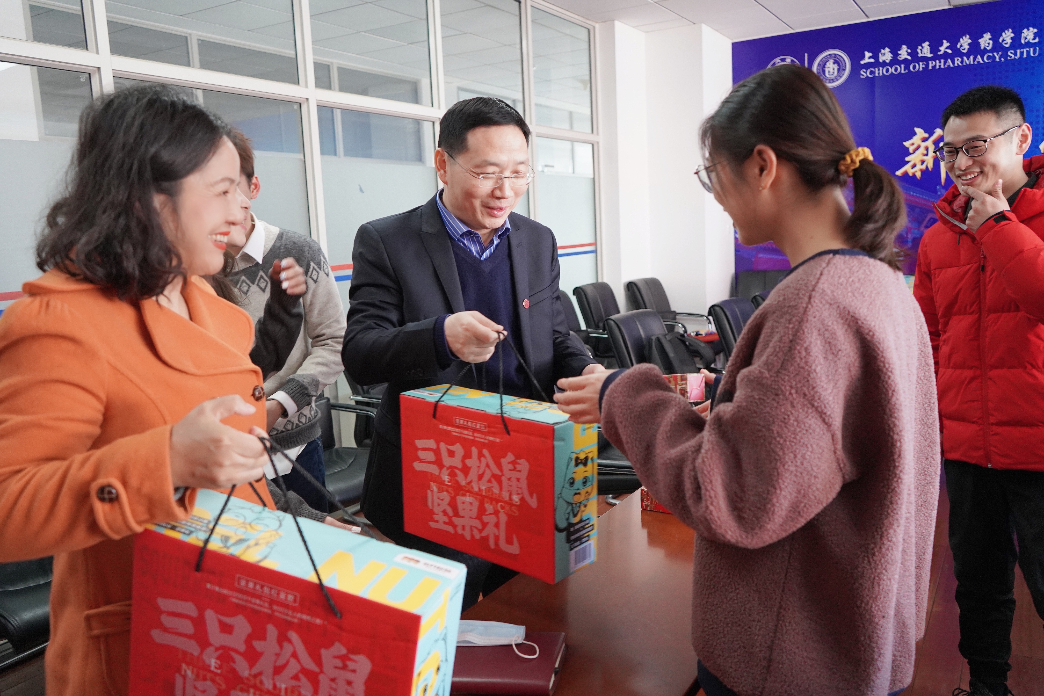 刘建新、张翱为参会同学发放了新春礼包并合影留念。